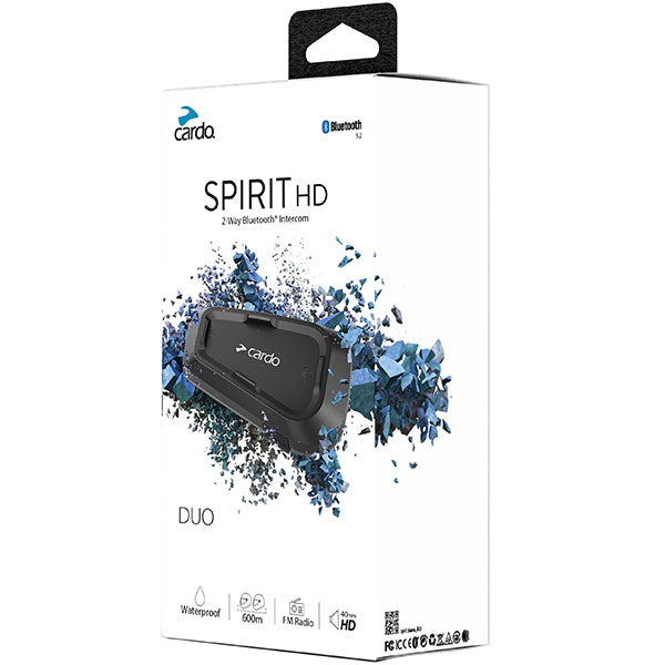 The Cardo Spirit HD is a wideband Bluetooth 5.2 intercom system with powerful 40mm HD speakers, an advanced processor, and three distinct audio profiles to transform any ride. Being waterproof and dust-proof, no matter what you throw at it Spirit HD will take the beating and keep you connected - rain, shine, mud, dust or snow. Connecting two riders it has a range of up to 600m / 0.4mi. With its universal connectivity, it will connect with any of the leading Bluetooth headset brands. Keeping the unit up to date is easy with the Over-the-Air software updates with the Cardo Connect App, which is also used to alter settings.