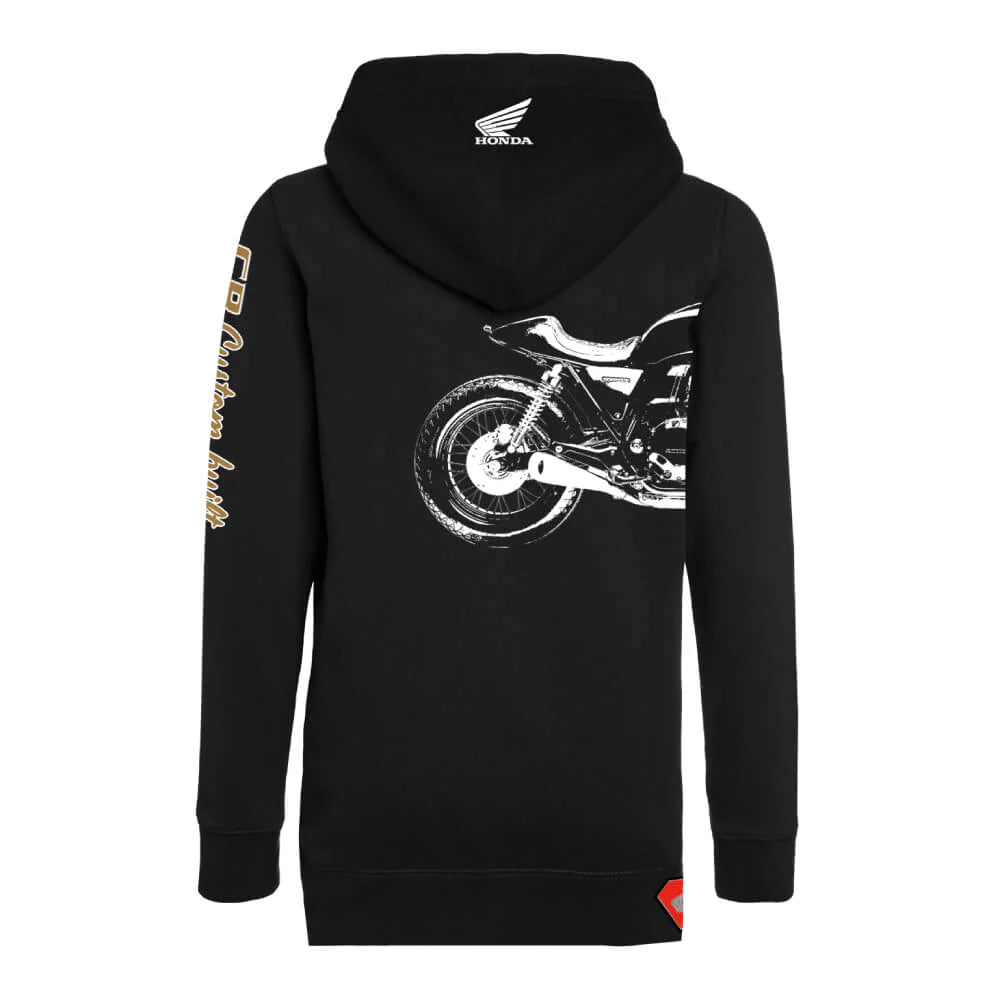 Step into the legacy of Honda's iconic CB series with the Honda Custom Built Hoodie. Inspired by the craftsmanship of custom workshops since the 60s, this black hoodie pays homage to the timeless CB motorcycles. The celebration unfolds with a striking white graphic showcasing the CB motorcycle, elegantly wrapping around the chest, side, and back.