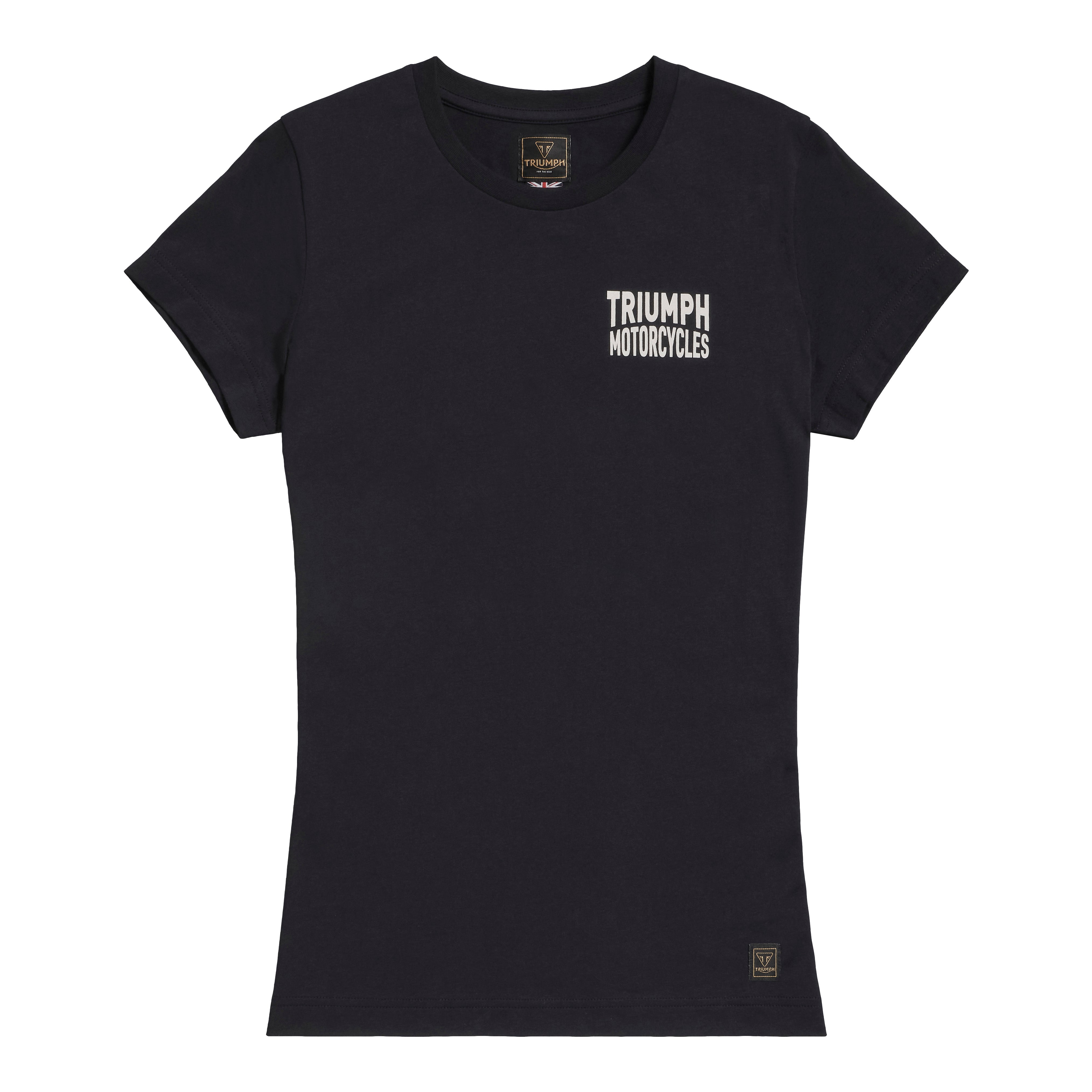 A classic fit tee with small stylised "Triumph Motorcycles" text on the front and "Piston Rich Skull" back graphic.